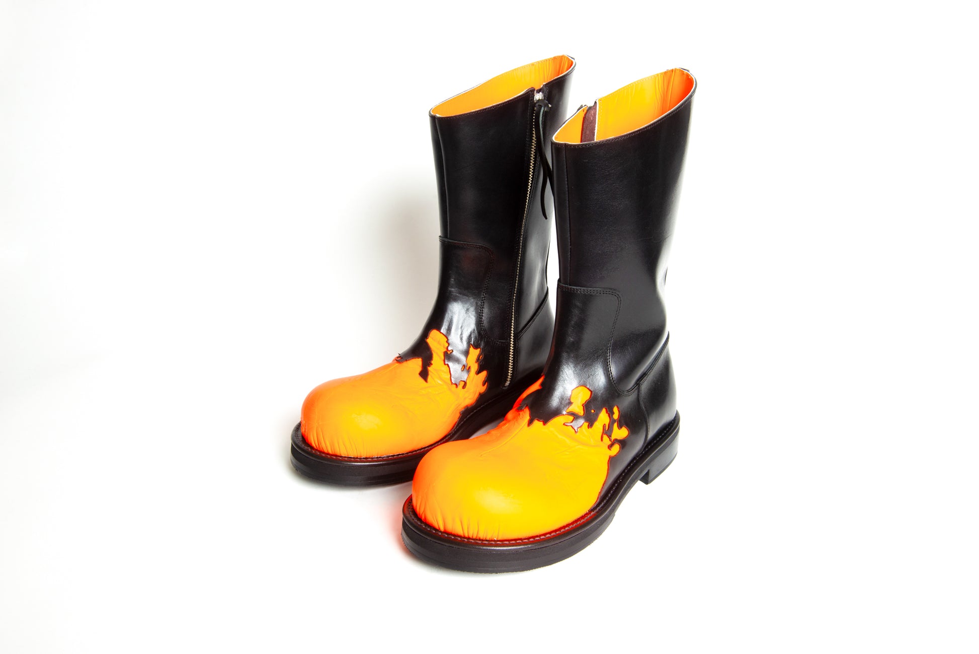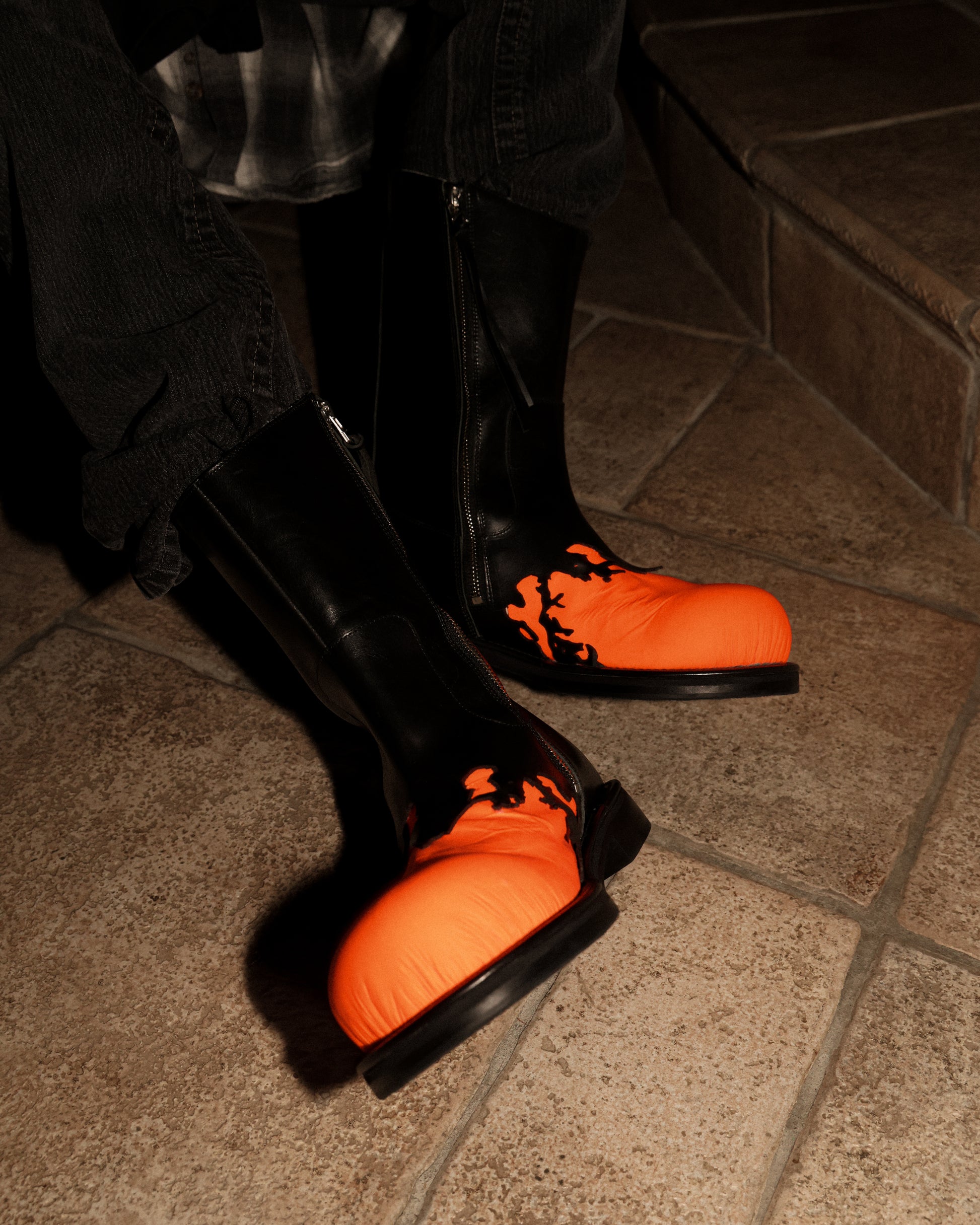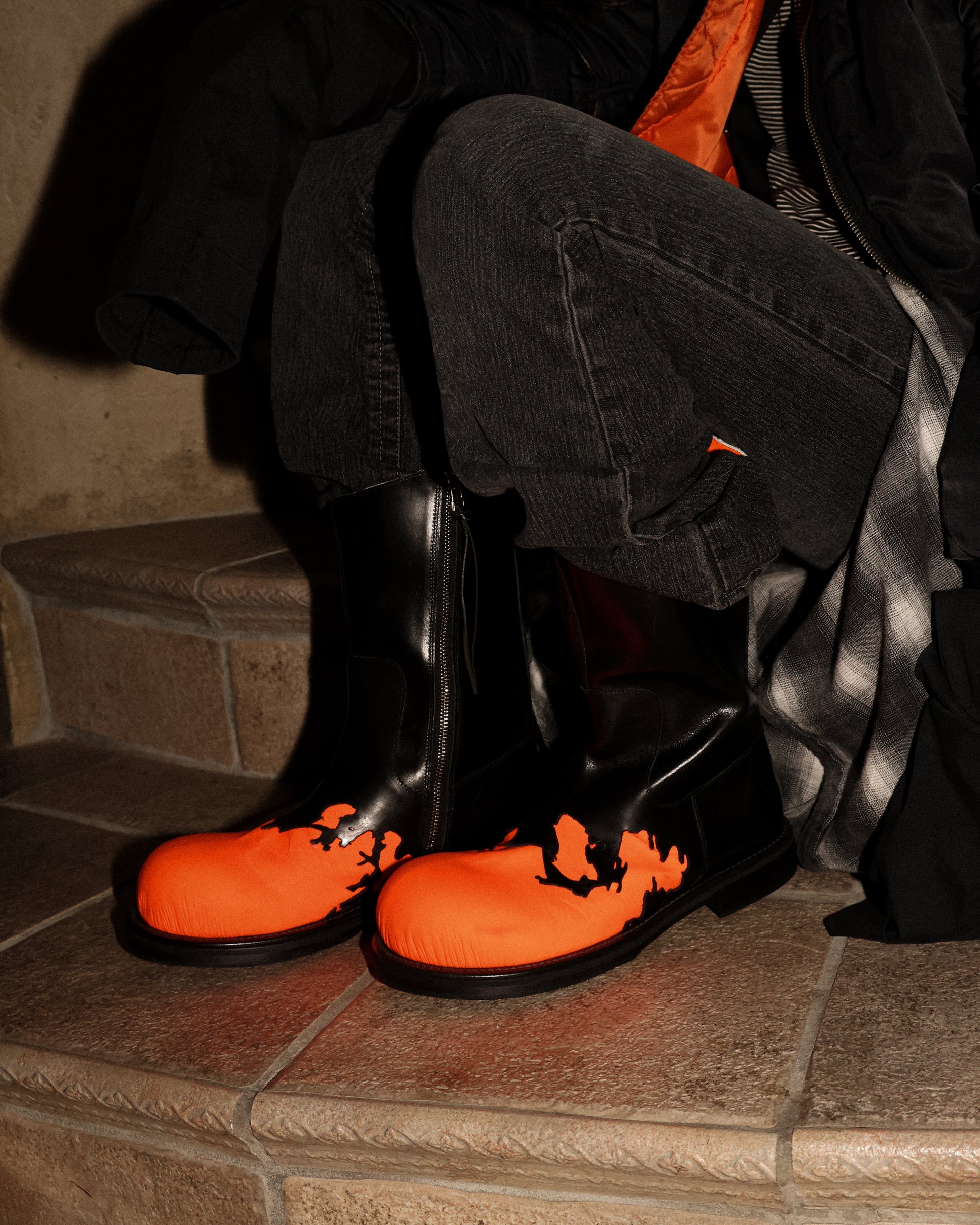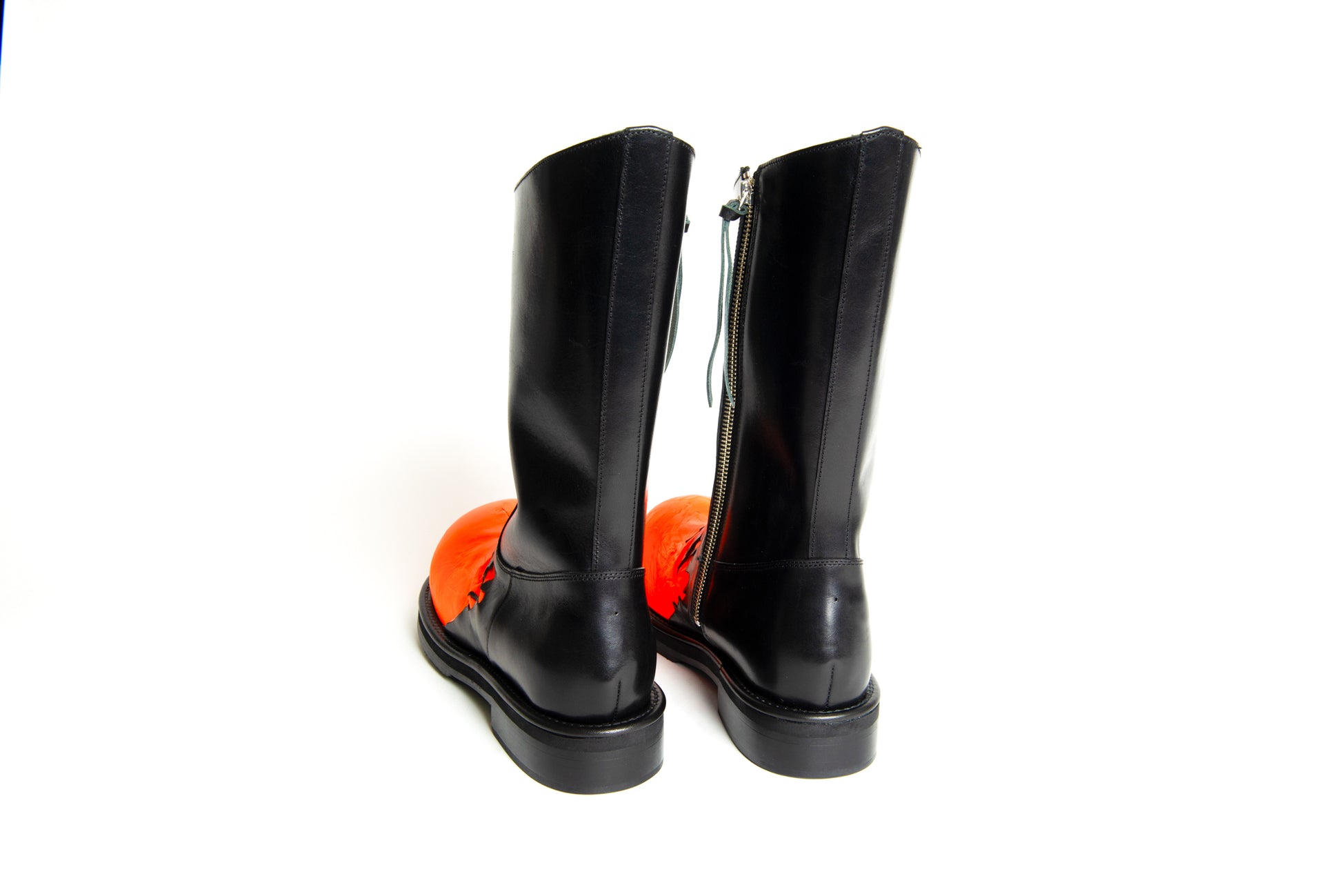 (カットアップされた言葉の断片が刻まれた荒々しい傷を纏うロングブーツ。荒野に散らされた痕跡が、意味を継ぎ接ぎながら終わりのない旅を続ける。)
