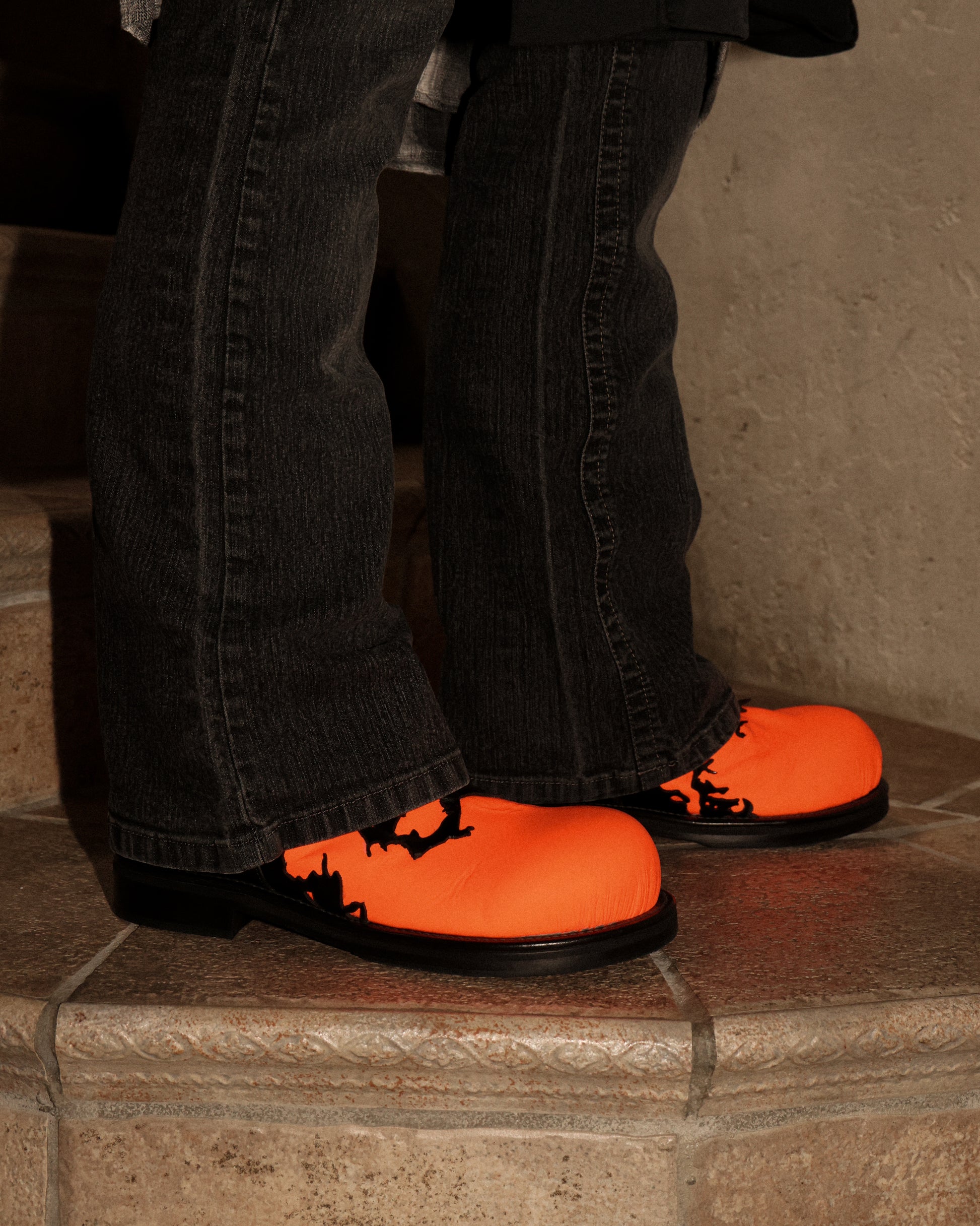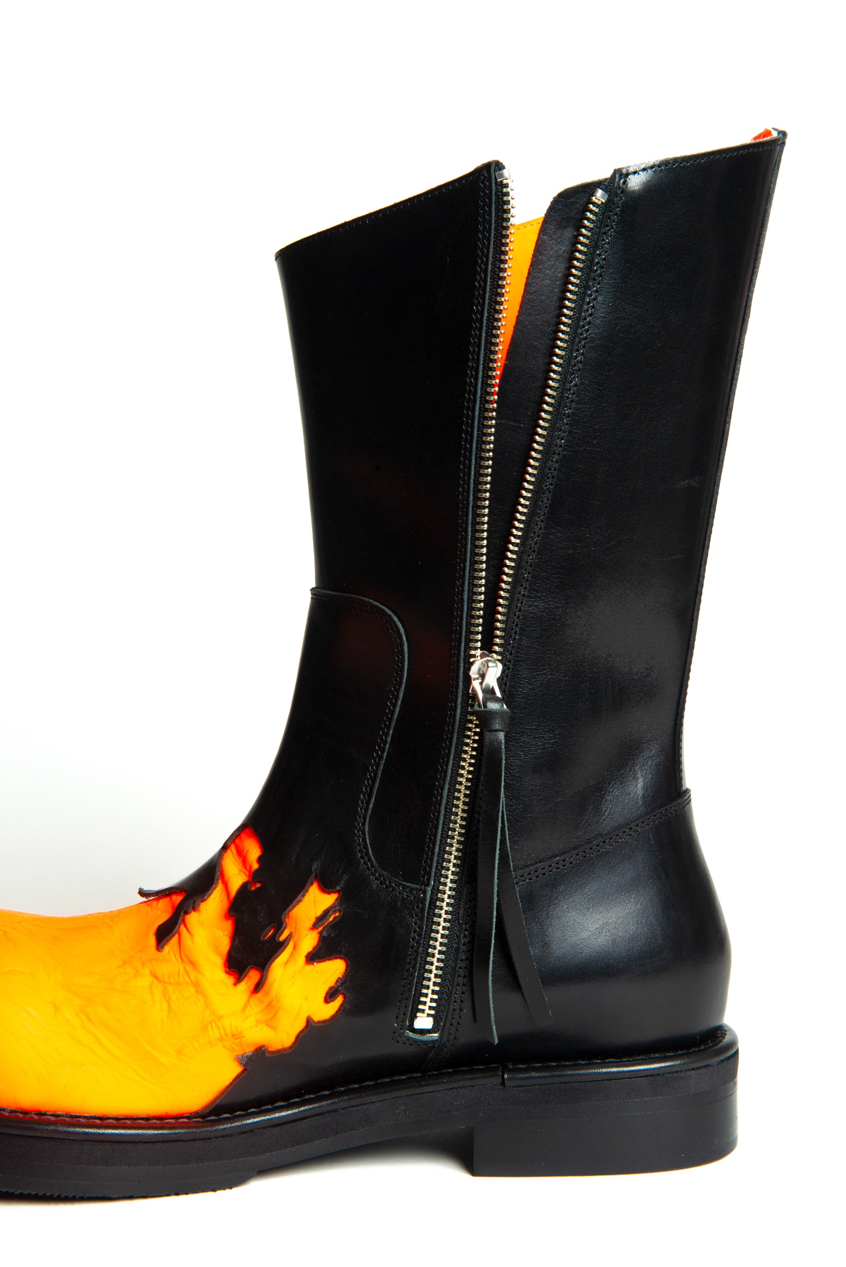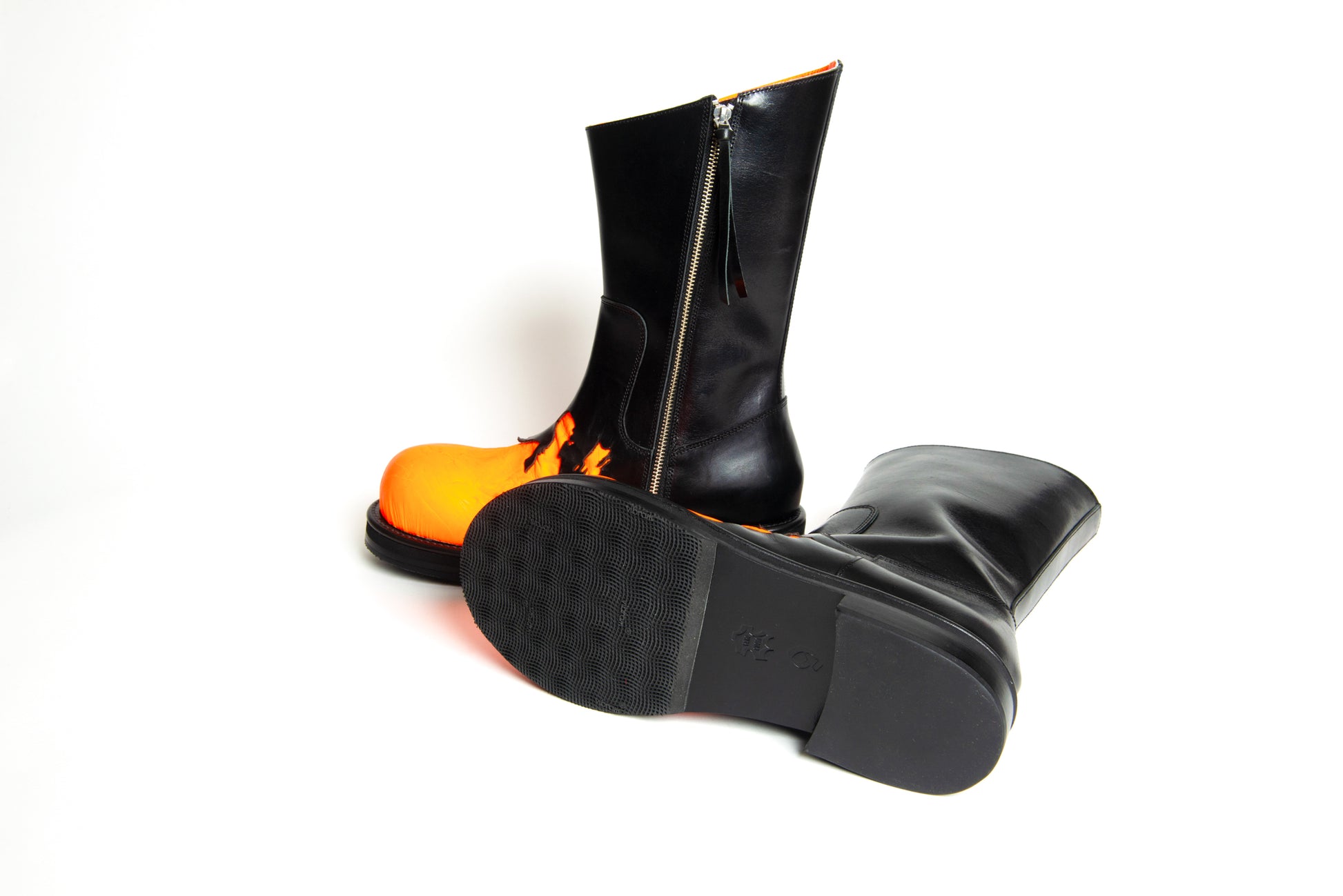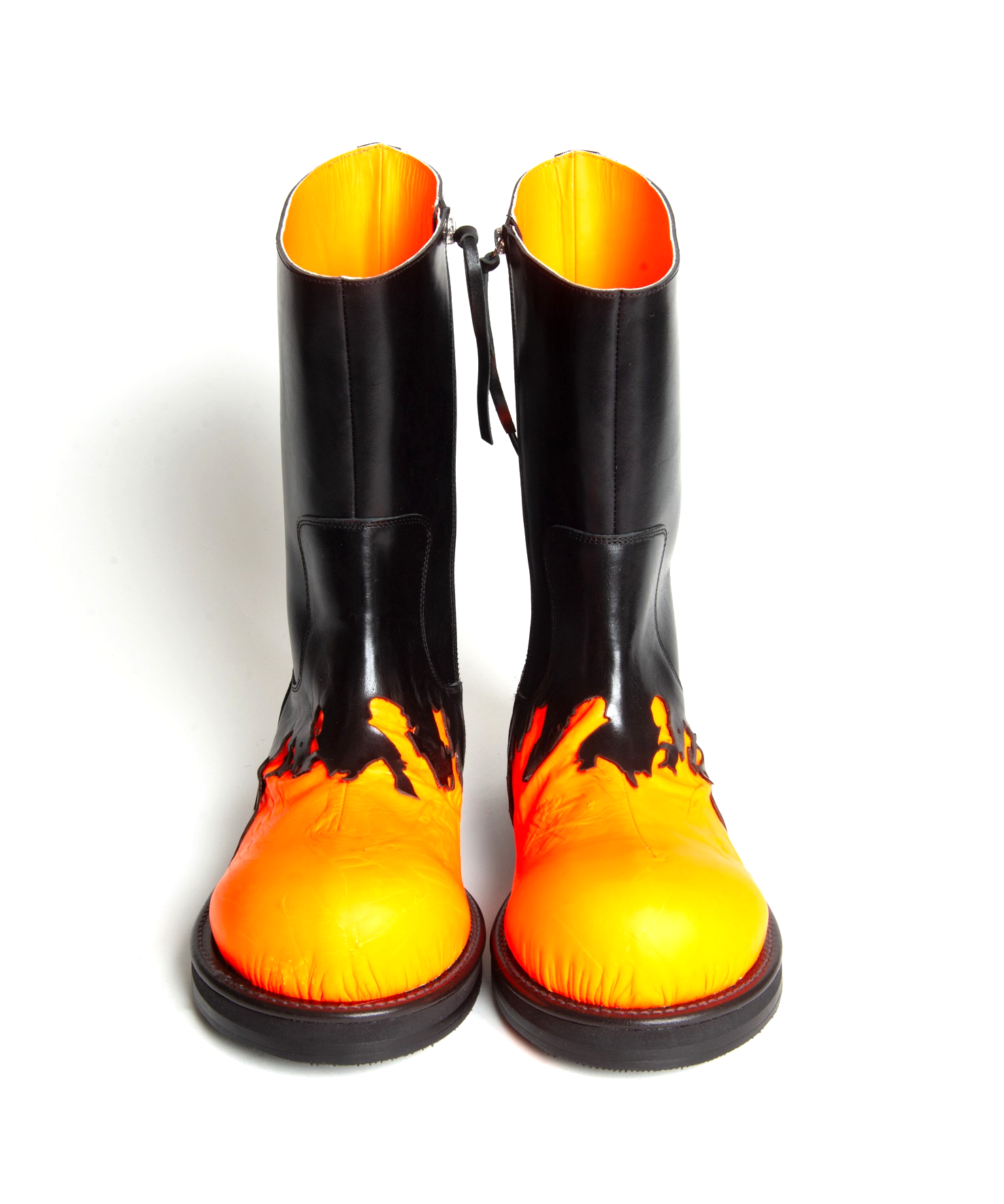 (カットアップされた言葉の断片が刻まれた荒々しい傷を纏うロングブーツ。荒野に散らされた痕跡が、意味を継ぎ接ぎながら終わりのない旅を続ける。)