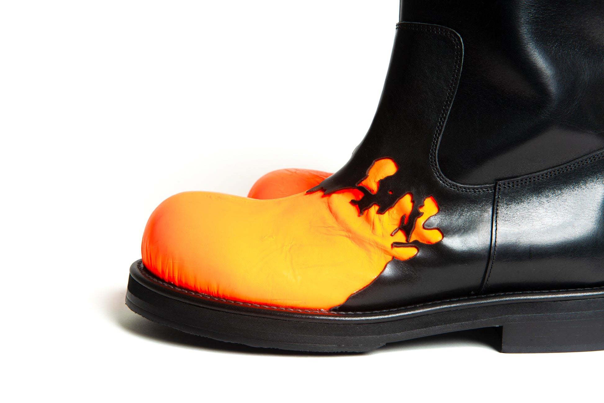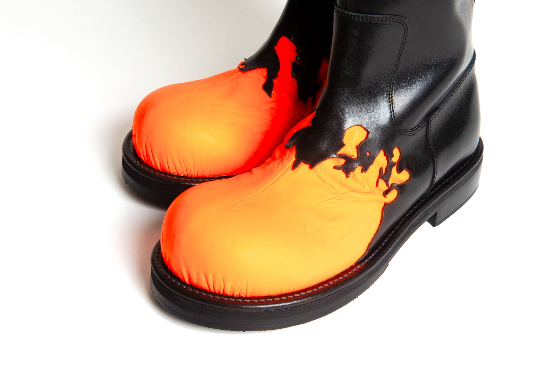 "A pair of boots etched with raw scars, like fragmented words cut and rearranged. Their traces, scattered across a barren wilderness, stitch meanings together, wandering endlessly in search of resolution."