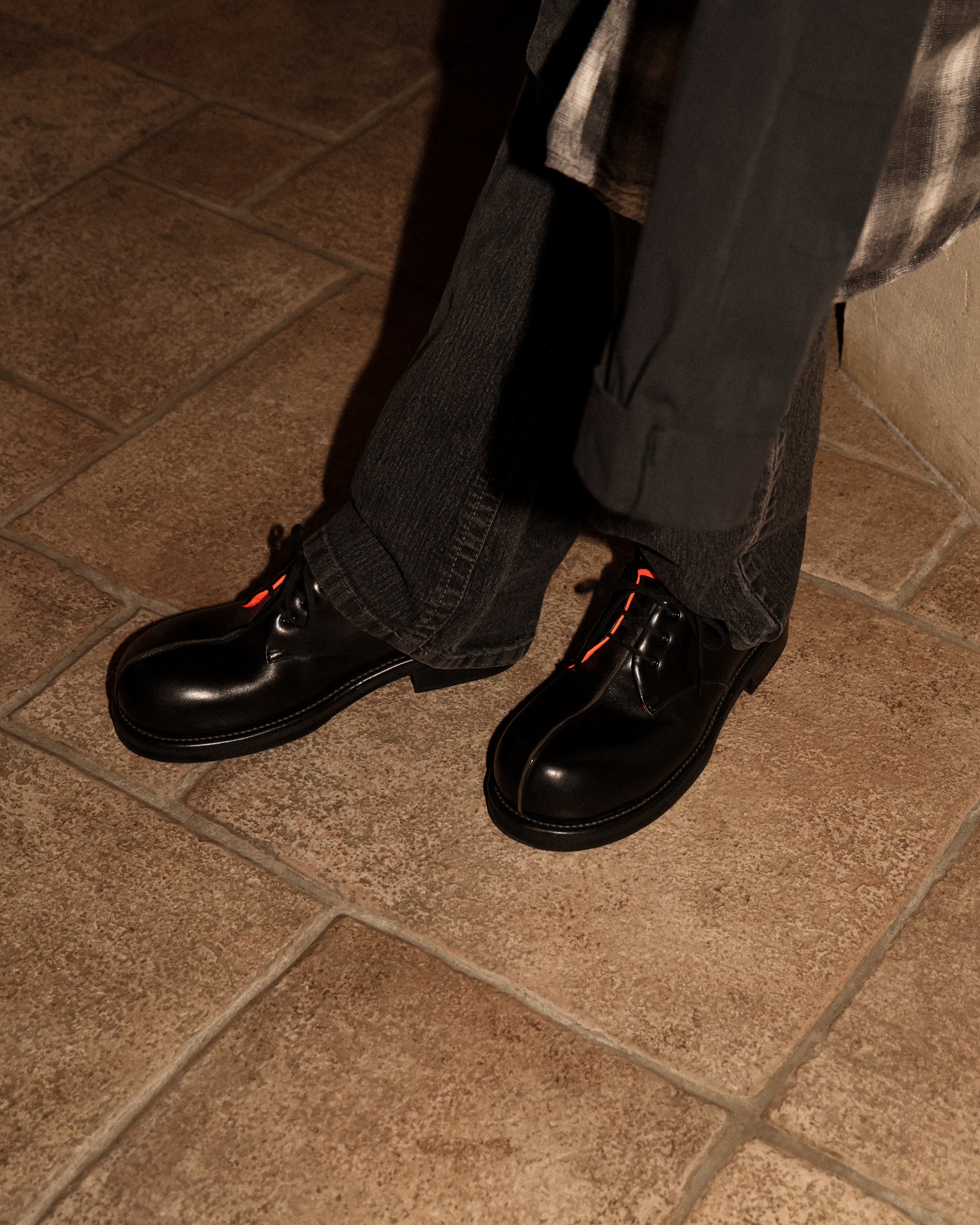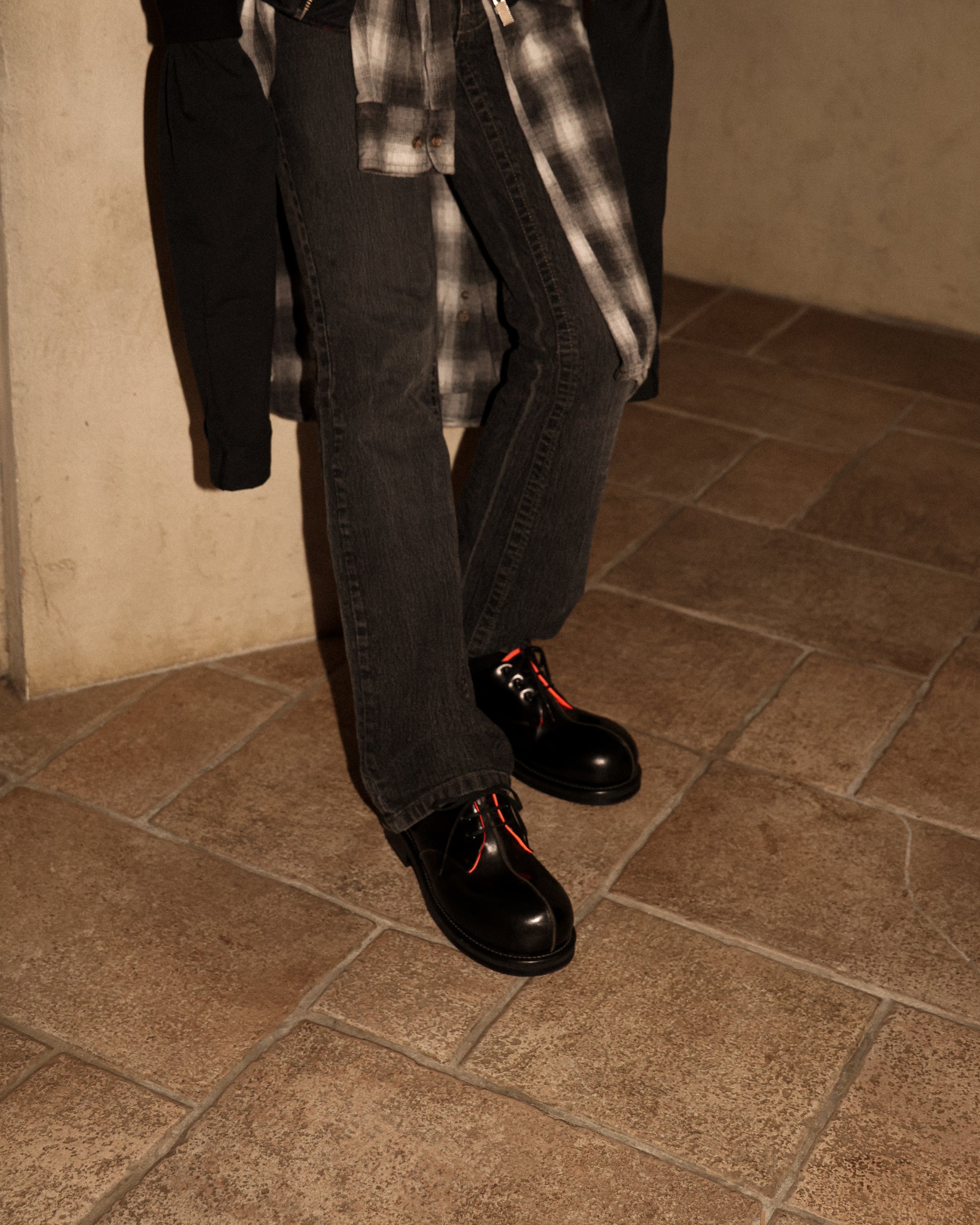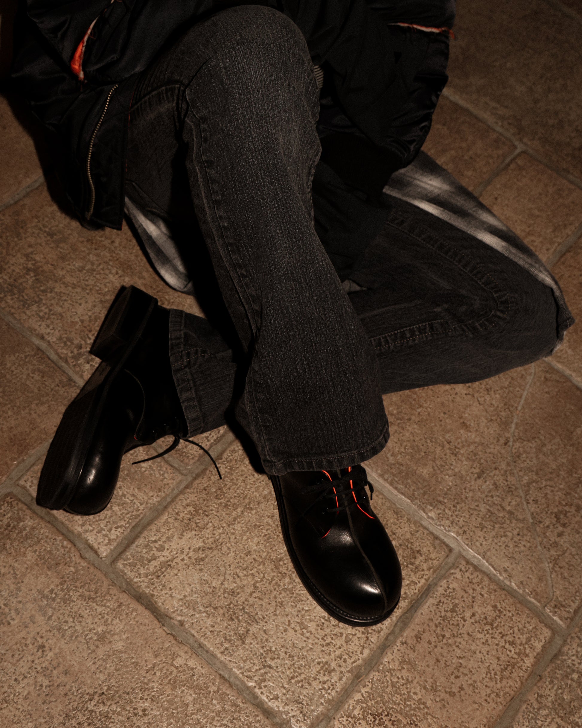 "The central seam running along the upper is reminiscent of a single thread of love that protects Mathilda, featuring MA-1-inspired liner detailing in this plain-toe shoe."