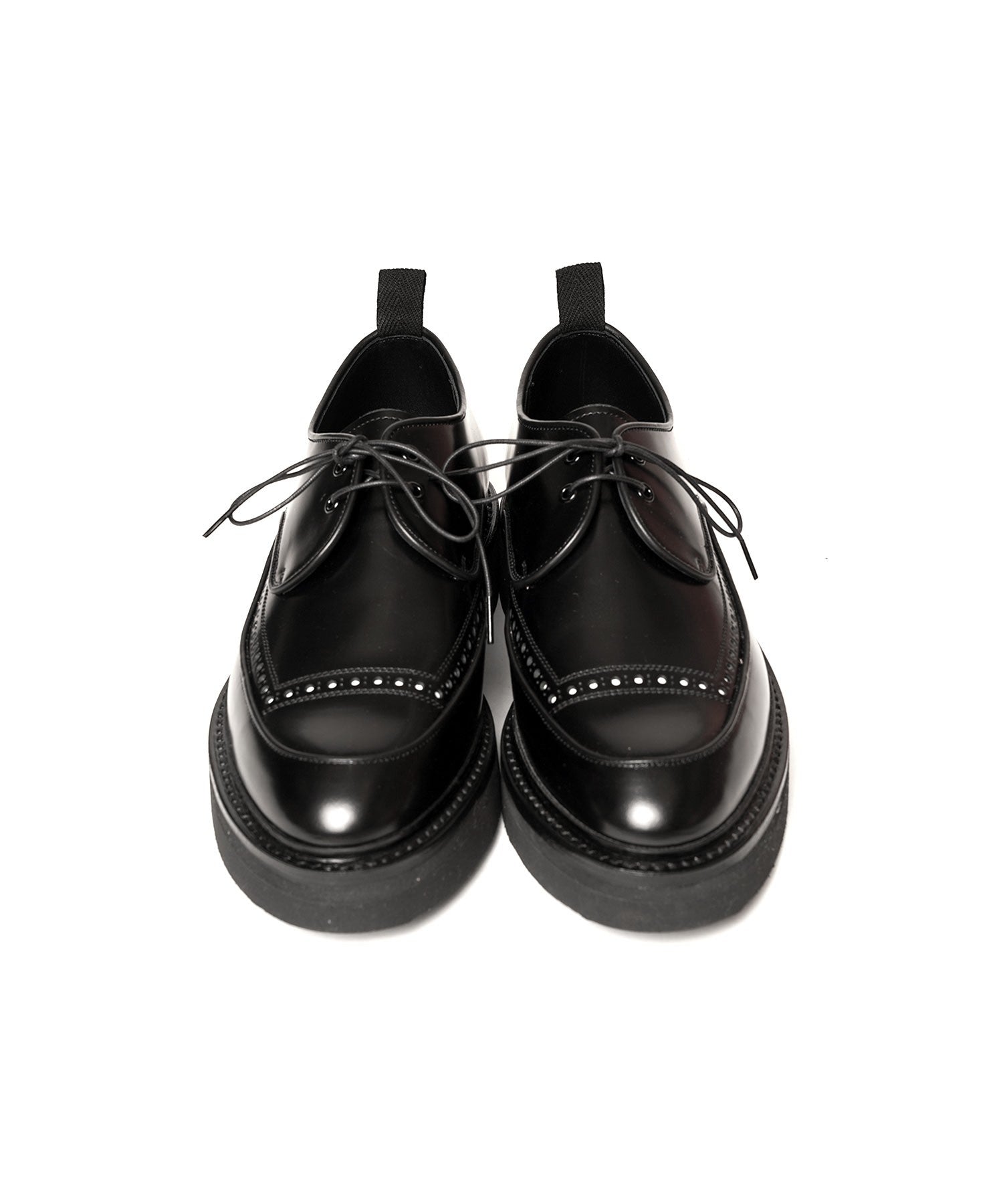 KIDS LOVE GAITE の原点、UKらしさ溢れるポインテッドトゥシューズ。 シャープな木型にモカシンタイプを採用することで、木型のラインをより際立たせた1足。 ほどよく尖った木型、角の無い丸みのある羽根のライン、直線的に配された穴飾りと、直線と曲線が美しい調和を生み出している。 さらに羽根周りにパイピングディテールを加えることで、Uチップとも呼ばれるモカシンラインと繋がったように美しい曲線で縁どられている。 他モデル同様に、黒1色で仕上げた中に穴飾りの下に配した白革とリニューアルした中敷きのブランドロゴが映える。 シュータンのさらい残し、踵補強の棒市、杉綾テープのプルタブ、同色のオリジナルサイズ印等の細かい部分も手を抜かず丁寧に仕上げた。