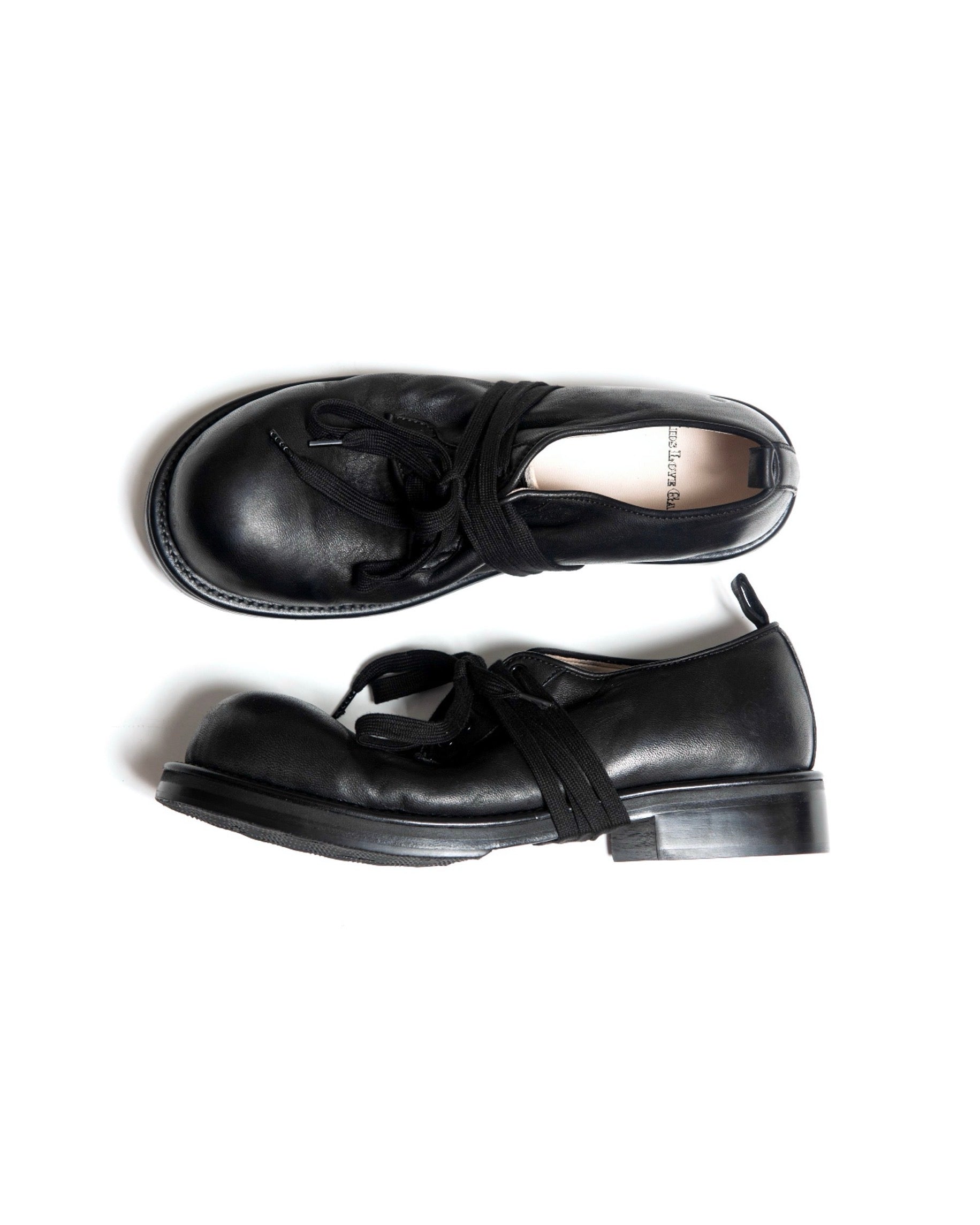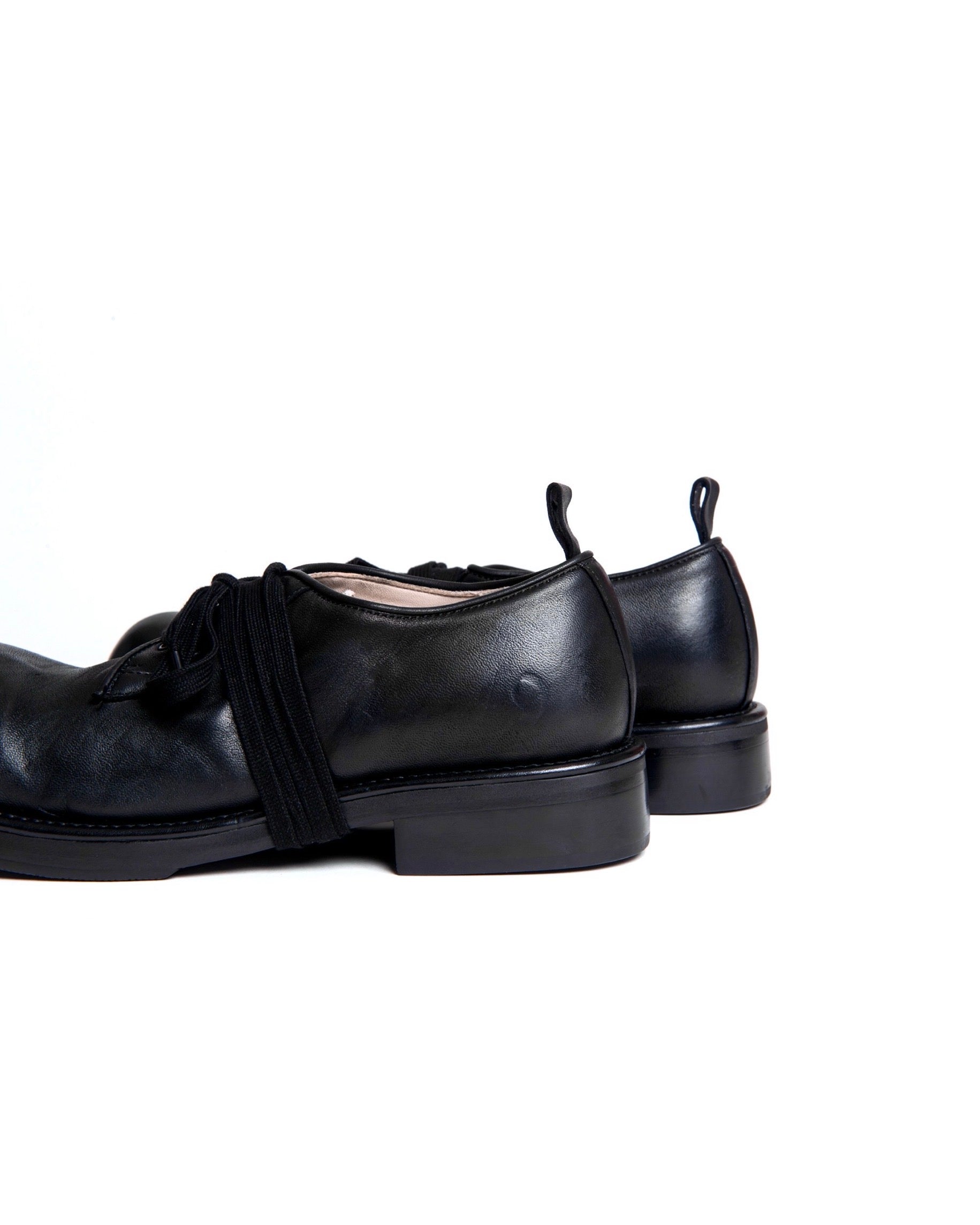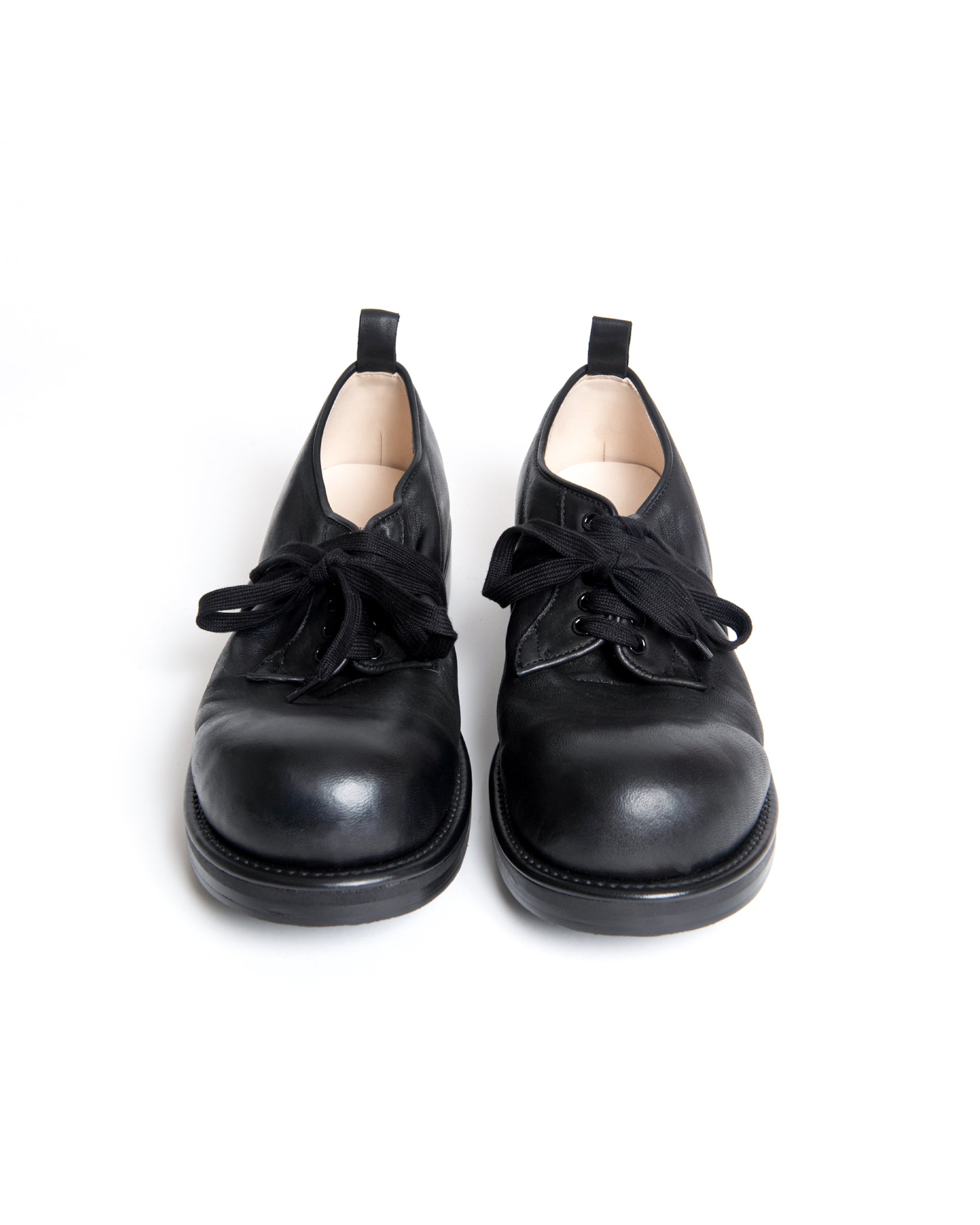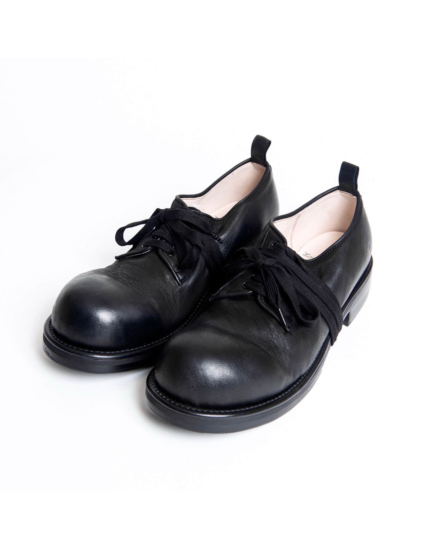 ミリタリーミッキーブーツからインスパイアされた木型を使用したシンプルな外羽根シューズ。特徴的な木型のラインを活かすべくディテールを削ぎ落として仕上げた1足。またコバ幅を通常より大きくとることで木型のラインが強調されている。側面まで一体感のある見た目に仕上がっているのはソールとアッパーの間にある押渕にアッパー素材を使用することで実現。中敷き下に厚みのあるクッション材を入れることで、革底ながら柔らかく快適な履き心地。カカト部にオリジナルサイズ刻印。